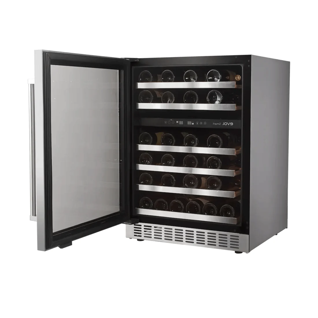A Adega Climatizada Evol com acabamento inox e porta de vidro, possui capacidade de até 46 garrafas/ 135 litros com duas zonas de temperatura, que permite manter duas zonas com temperaturas distintas para guarda ou serviço de diferentes tipos de vinhos e espumantes. sempre protegendo a qualidade e o sabor dos vinhos.