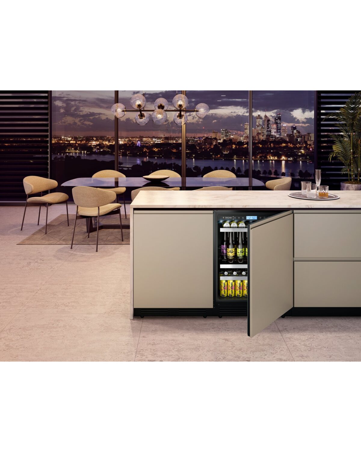 A Cervejeira Tecno TR14CRDD pode ser instalada no piso ou embutida, com ventilação pelo rodapé frontal, e compõe conjuntos elegantes com outros produtos para revestir Tecno, como a adega TR14ARBD.