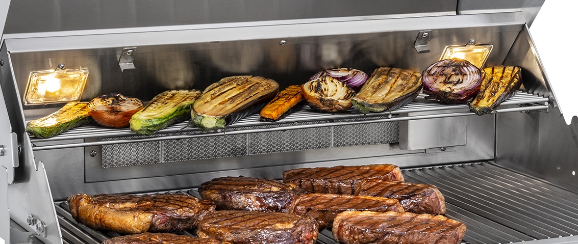 chapa grill em inox, pedra para pizza em cordierita, caixa defumadora em inox, espeto giratório, briquetes cerâmicos e defletores de calor em formato W, proporcionando resultados mais saborosos e profissionais.