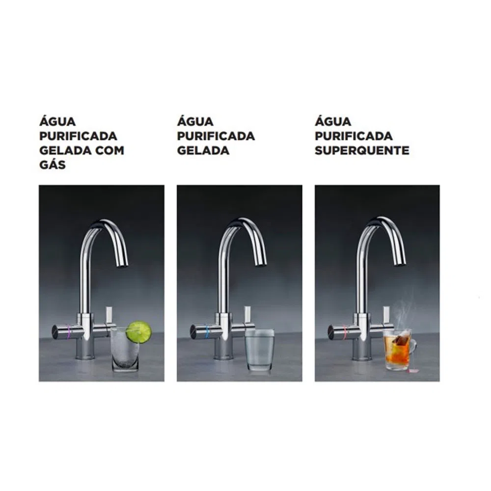 A água purificada gelada com gás permite a regulagem da temperatura entre 3° e 15°C. Praticidade ao toque de um único botão para beber água com gás ou fazer um drink. As águas purificadas e da rede não têm qualquer contato, percorrendo caminhos separados no interior do produto, o que garante segurança e facilidade na manutenção.