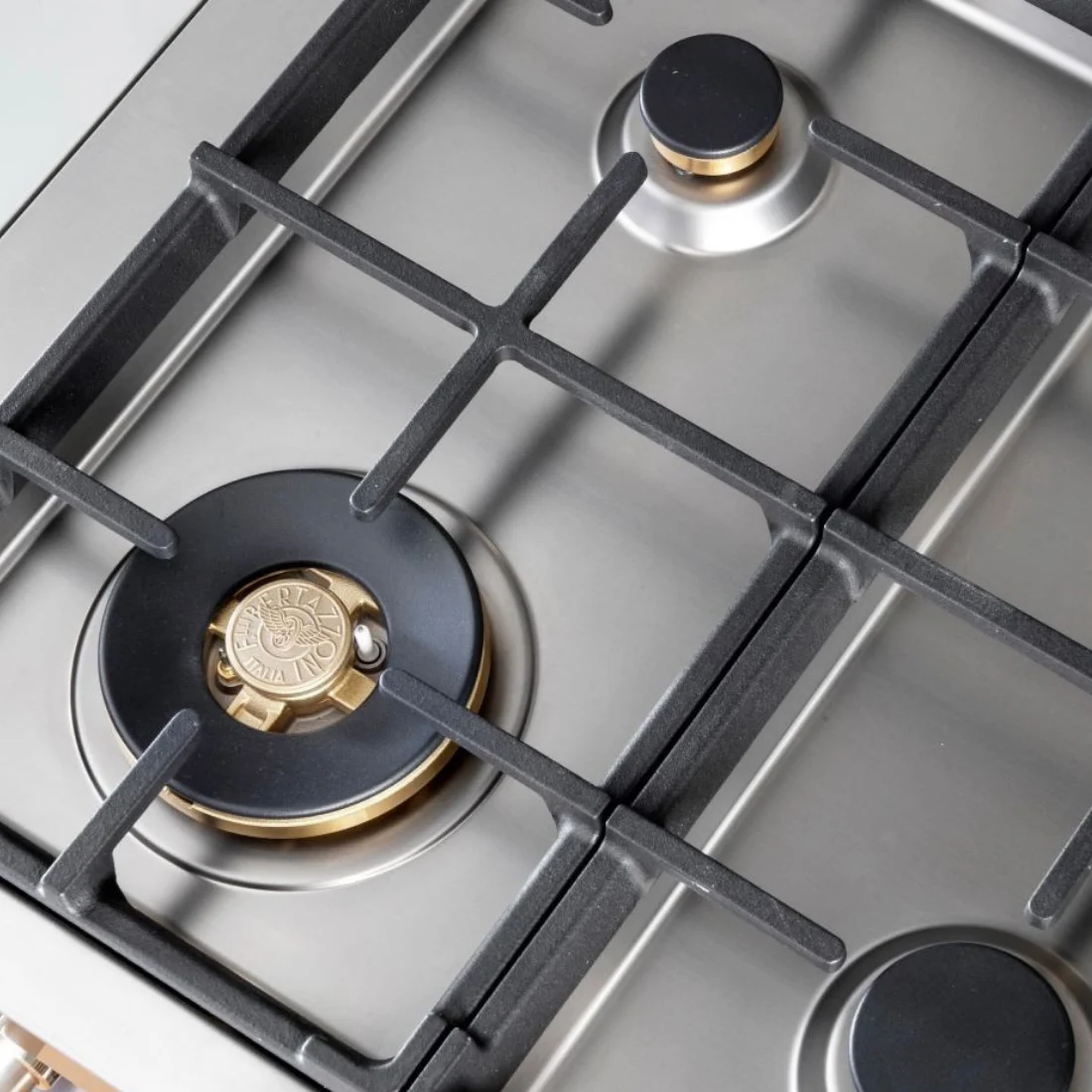 No design, o rangetop impressiona com seu acabamento em aço inox escovado, manípulos em metal maciço e trempes robustas em ferro gusa, elementos que reforçam sua durabilidade e traduzem a essência do autêntico design italiano.