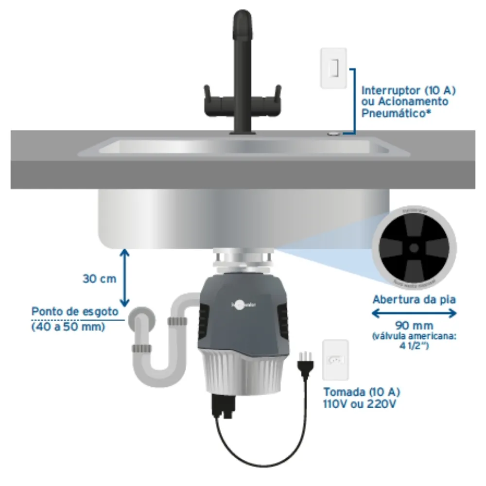 Projetado para instalação sob a pia, o equipamento tritura resíduos orgânicos de forma rápida e silenciosa, reduzindo significativamente o volume de lixo e eliminando odores indesejados. Uma escolha inteligente para cozinhas contemporâneas e projetos de alto padrão.